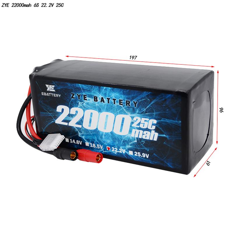 | 22000mAh | 6S 25.2V | 22.2v | 488WH | 200*91*63 | 2.54 किग्रा | 264 ए (12 सी) | 550 ए (25 सी) |